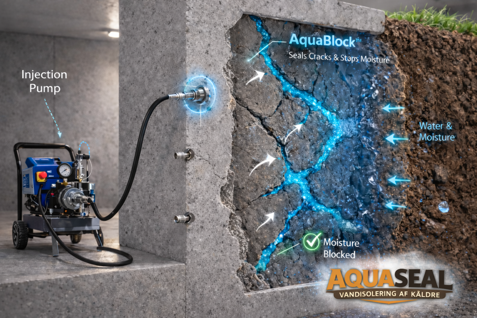 Hos AquaSeal arbejder vi med professionelle metoder til tætning af kældervægge, så vandet stoppes effektivt ved kilden. Ved hjælp af injektionsteknik bores der små huller i kældervæggen, hvor et specialmateriale pumpes ind i revner og hulrum i konstruktionen eller i jorden bag væggen.